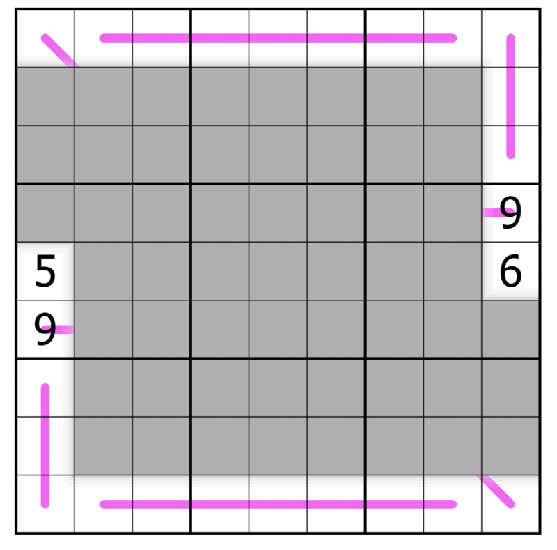- Renban: Digits placed on purple lines must be a non-repeating set of consecutive digits in any order. For example, a 3-cell line could contain the digits 456, arranged as 456, 564, 465, etc.