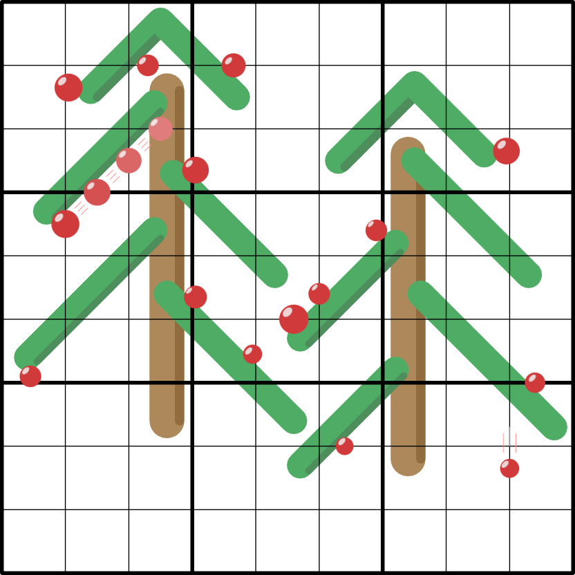 Christbaumkugeln: Ziffern, zwischen denen sich eine rote Christbaumkugel befindet, stehen im Verhältnis 1:2. Eine Ziffer ist also genau das Doppelte der anderen.