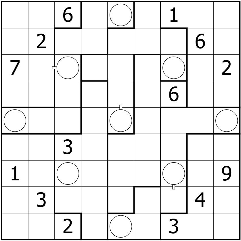• Parasites: Draw parasites moving orthogonally through the grid that connect all circles that share the same digit. Parasites may not move diagonally, branch, or cross themselves nor each other, but they may touch themselves and each other otherwise. The start and end of each parasite must occur on distinct circles. Small white rectangles indicate cell borders crossed by a parasite or different parasites.