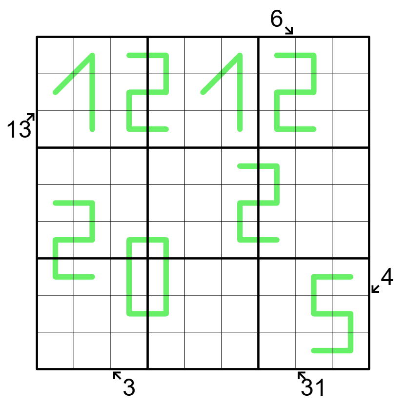 Little killer: A clue outside the grid gives the sum of the digits along the indicated diagonal.