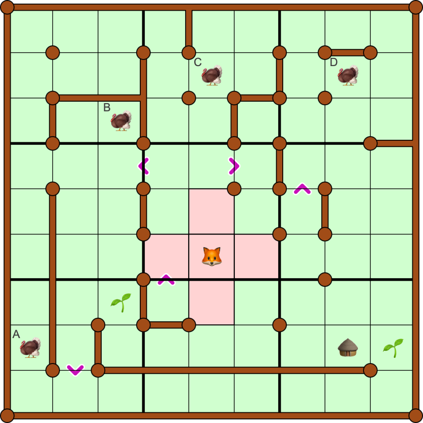 • The Fox will attack any turkey that goes onto its cell, or any orthogonally adjacent cell (highlighted in red). No turkey path may pass through any of these cells.