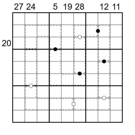Cage Kropki:Kropki Punkte zwischen zwei Käfigen beziehen sich auf die Summen der Käfige anstelle der individuellen Ziffern.