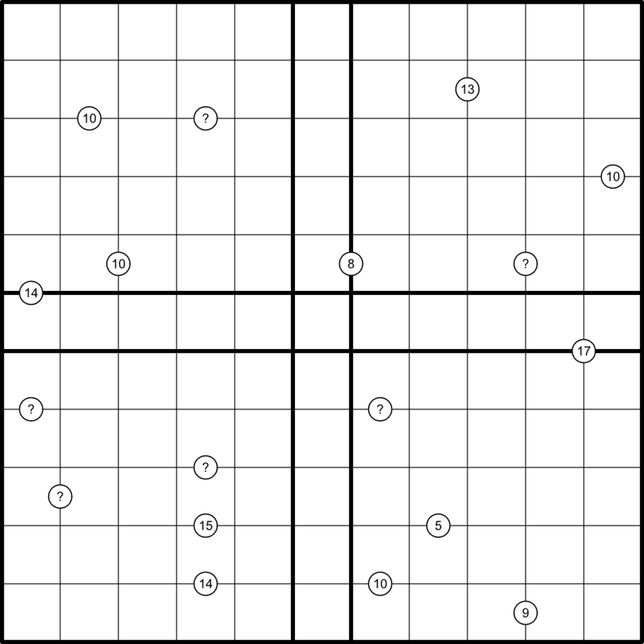 Stakeout Circles - Cells surrounding a white circle must belong to different regions, and the corresponding regions must not share more than a 1-cell wide border. Digits surrounding the circle must sum to the clue inside the circle (if given).