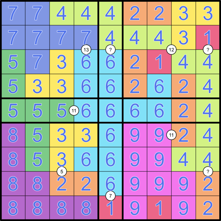 Stakeout Circles - Cells surrounding a white circle must belong to different regions, and the corresponding regions must not share more than a 1-cell wide border. Digits surrounding the circle must sum to the clue inside the circle (if given).