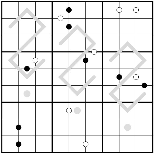 Kropki: white dots link cells which have a difference of 1. Black dots link cells which have a ratio of 1:2. Not all possible dots are given.