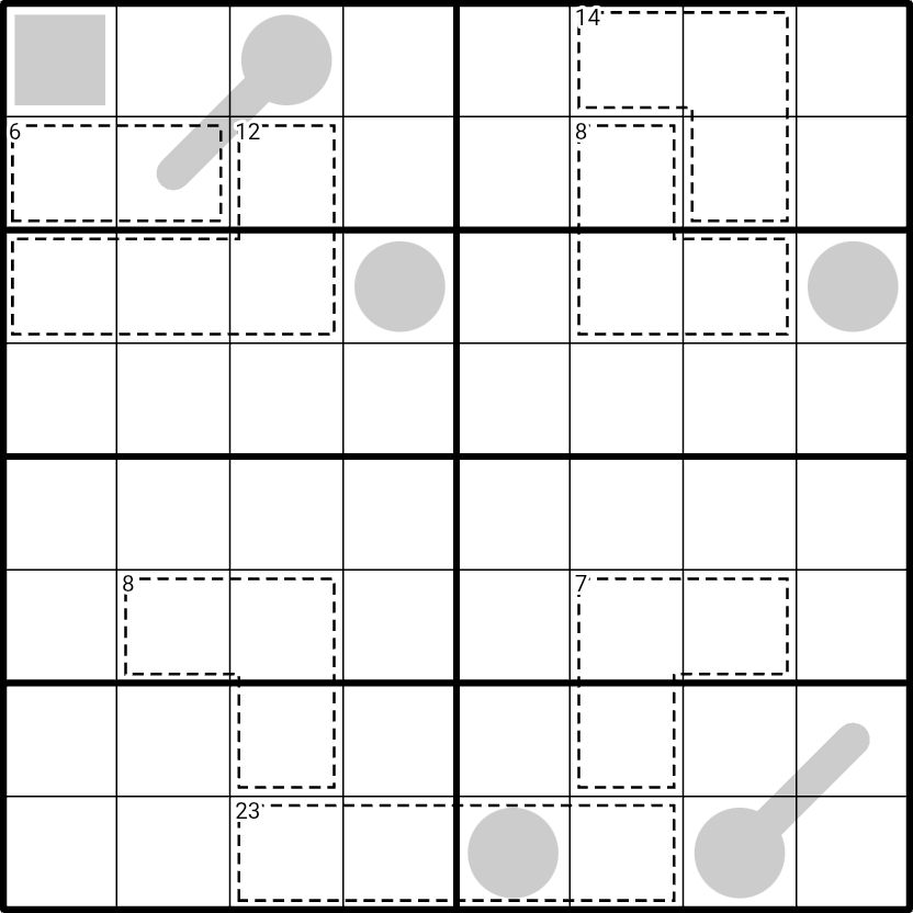 • Ziffern in Killer Käfigen addieren sich zu der angegebenen Zahl in der linken oberen Ecke. Ziffern wiederholen sich NICHT in Killer Käfigen.