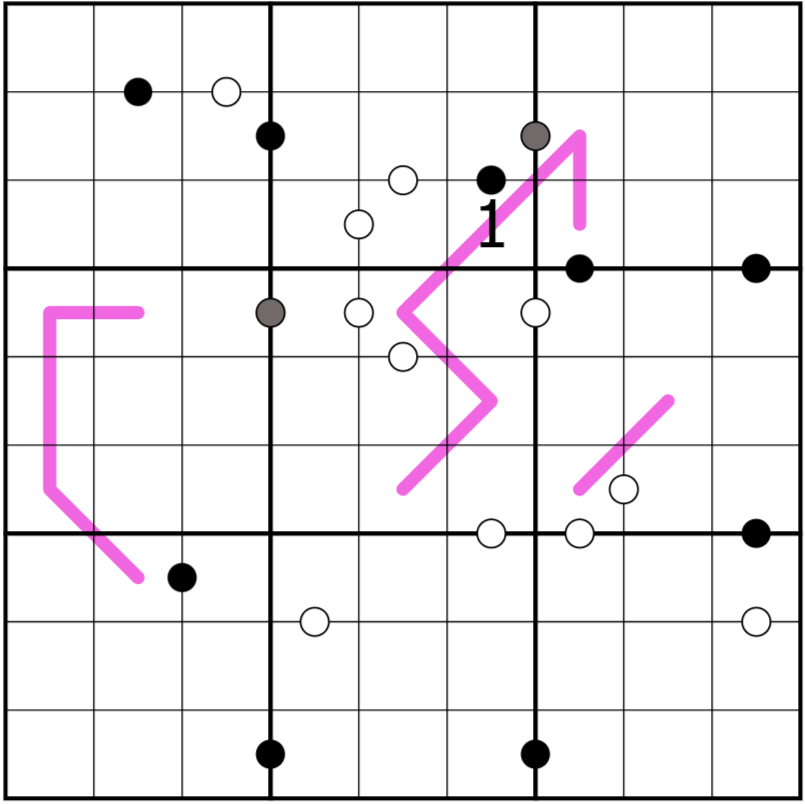 2. I'm not sure if this is intended, but the loop rule as written only forbids the loop from reentering the same cell twice; there's nothing stopping it from, say, squiggling back and forth through every cell of box 7.