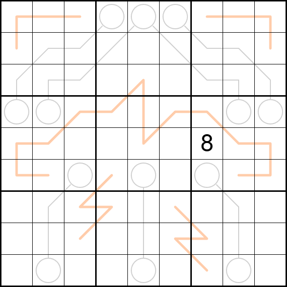 Entropische Linien: Jede Gruppe von drei aufeinanderfolgenden Zellen auf orangefarbenen Linien muss eine niedrige (1–3), eine mittlere (4–6) und eine hohe (7–9) Ziffer enthalten. Ziffern dürfen sich in einer Zeile wiederholen, sofern dies durch andere Regeln erlaubt ist.