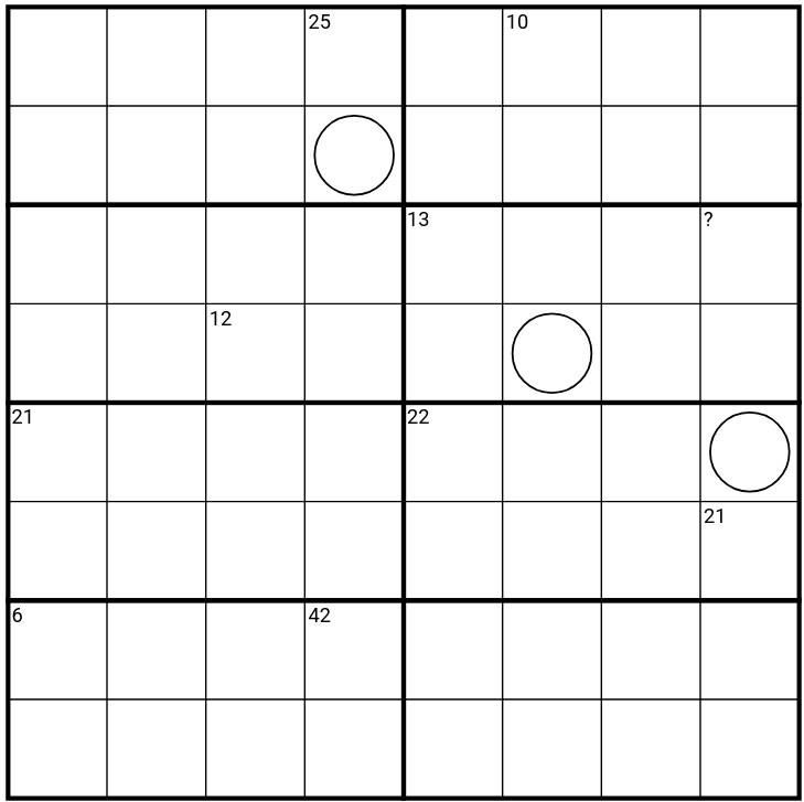 • The leftmost cell of the uppermost row of each island or lake may contain a number corresponding to the sum of the digits in that island or lake. Note that not all lakes or islands necessarily have their sum displayed. The question mark indicates that that square is the top leftmost square of an island or lake, but no sum is given.