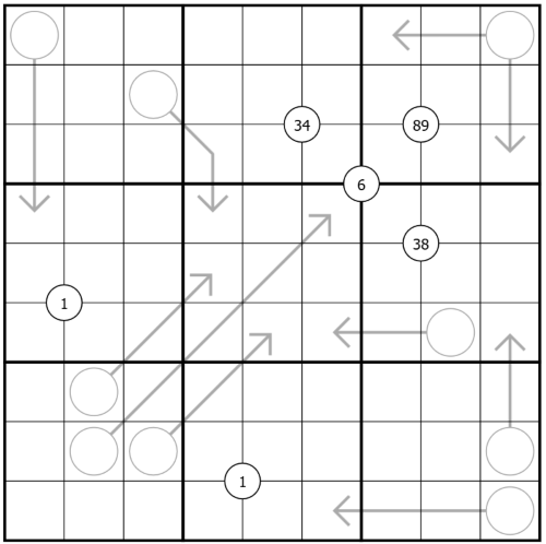 Es gelten die normalen Sudoku-Regeln. Die Ziffern auf einem Pfeil ergeben in der Summe die Zahl im zugehörigen Kreis. Ziffern in einem liniengebundenen weißen Kreis dürfen NICHT in den vier umgebenden Zellen erscheinen.