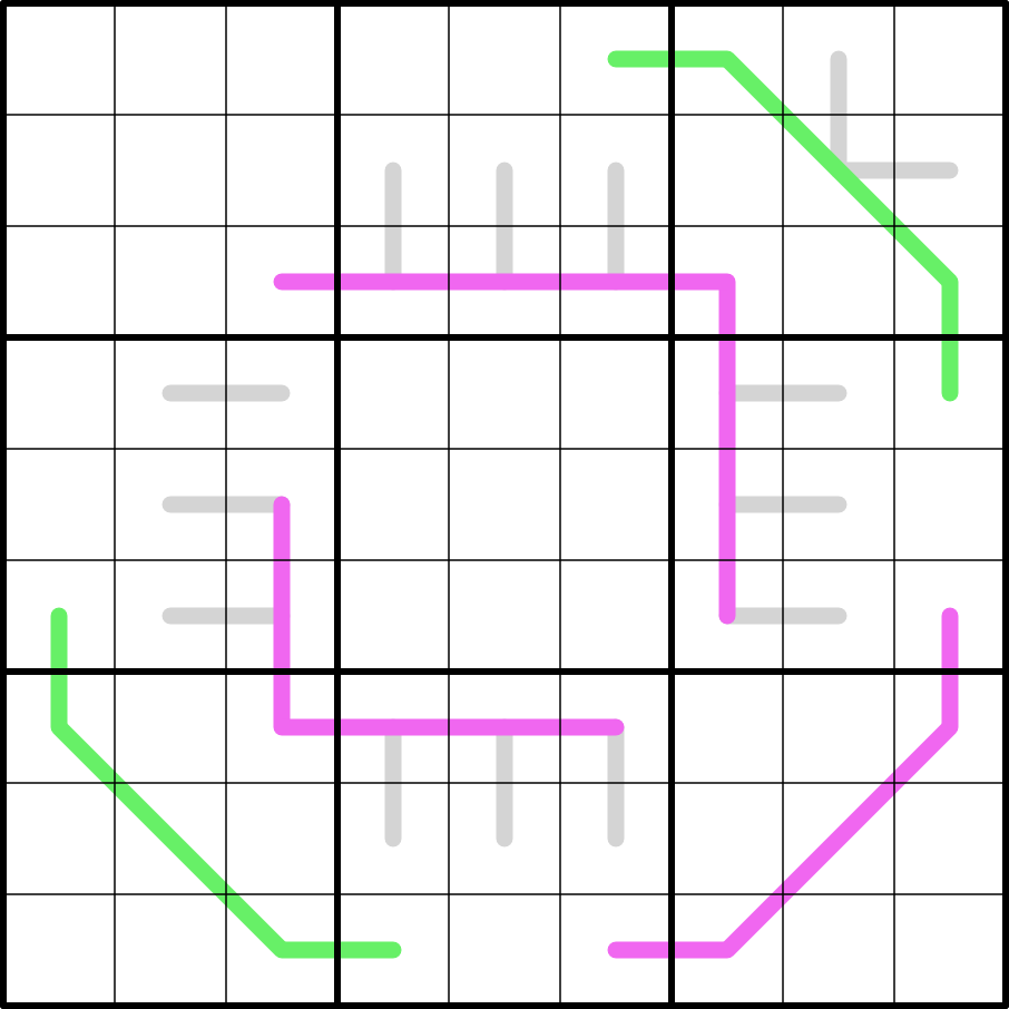 Digits along a pink line must form a non-repeating group of consecutive digits, but they may appear in any order along the line.