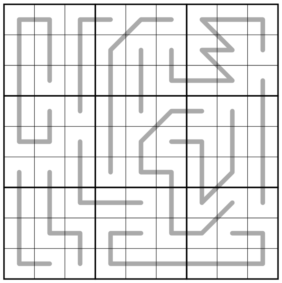 Every line in the puzzle conforms to one of 4 constraint types, listed below. No two orthogonally adjacent lines (i.e. two lines that pass through a pair of orthogonally adjacent cells) may be of the same constraint type.