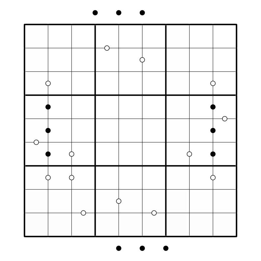 - White kropki dots connect two consecutive numbers, and black kropki dots connect two numbers where one is double the other. Not all dots may be given.