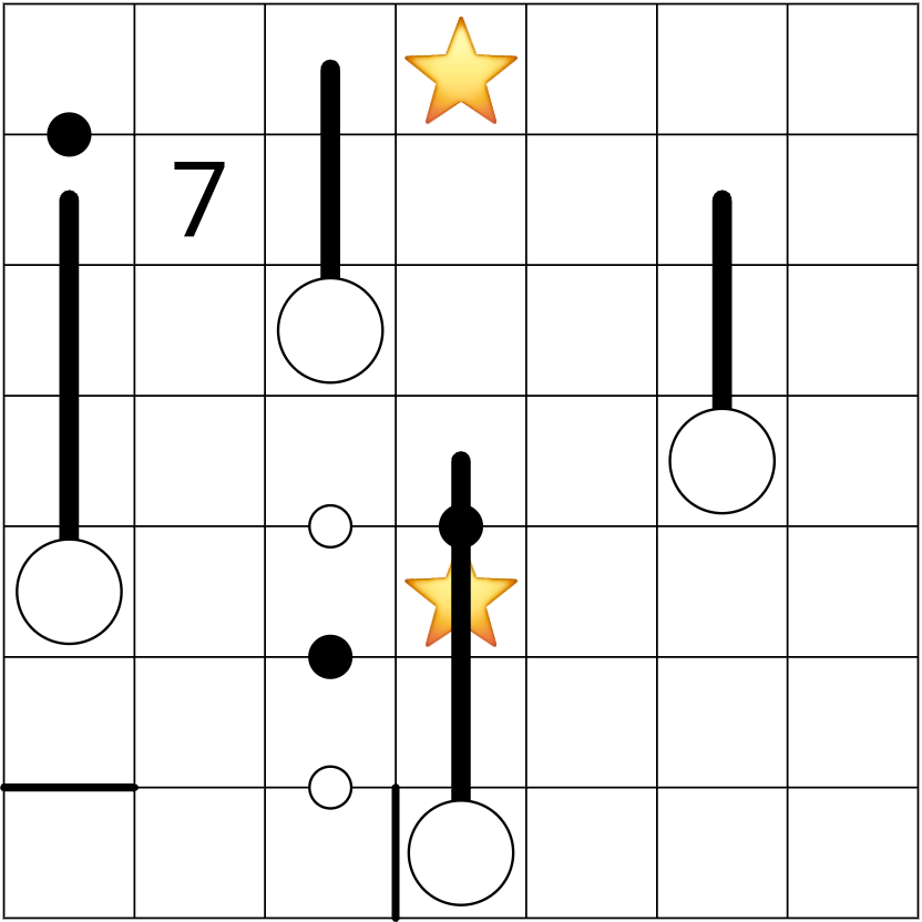 - Jeder Kreis ist mit einer Linie mit einer Länge von zwei oder drei Zellen. Entweder sind alle 2-Zellen Objekte Thermometer und alle 3-Zellen Objekte sind Pfeile oder andersherum. Außerdem sind Linien gleicher Länge positionell miteinander verbunden; Ziffern in entsprechenden Zellen entlang Objekten gleicher Größe müssen alle unterschiedlich sein.