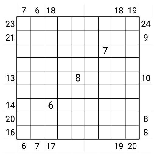 • Sum Frame: outside clues give the sum of the first three digits seen from that direction.