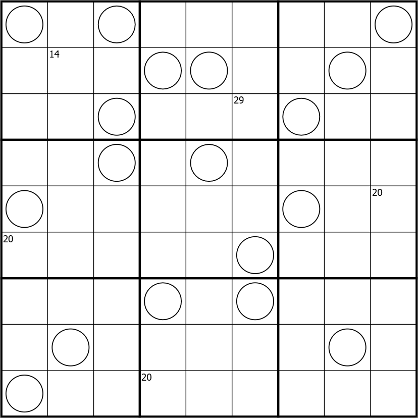 Cave Sums: A small number in the corner of a cell gives the sum of all digits seen orthogonally from that cell, including itself, where cells of the opposite shading block vision.