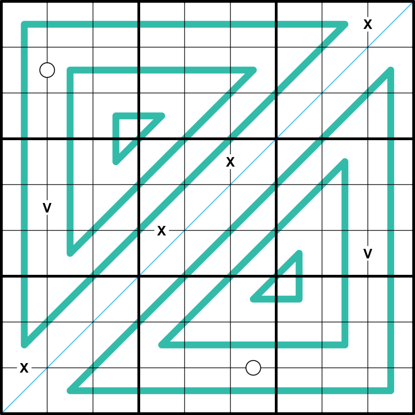 • Modular Lines: any set of three adjacent digits along a teal line must have different values modulo 3. In other words, it must contain one digit from the group (1,4,7), one from the group (2,5,8) and one from the group (3,6,9).