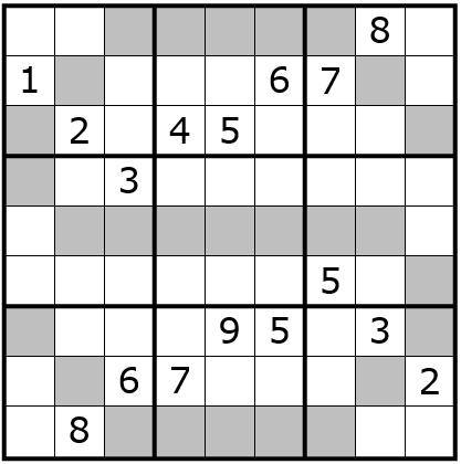 Die drei Zeilen und die drei Spalten aus drei 3x3-Blöcken enthalten jeweils 9 graue Kästchen, in denen ebenfalls die Ziffern von 1 bis 9 jeweils einmal vorkommen müssen. (Beispiel: R3C1+R2C2+R1C3-7+R2C8+R3C9.)
