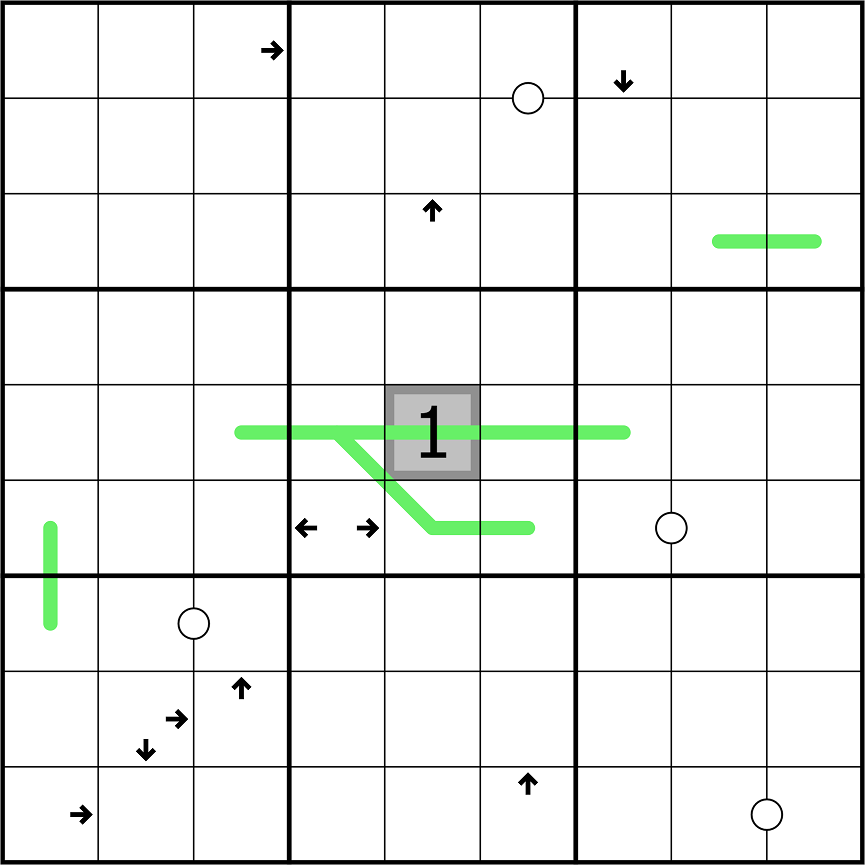 • Zellen mit einem oder mehreren Pfeilen zählen die Anzahl der Farbwechsel in der/den angegebenen Richtung(en), beginnend mit der eigenen Zelle (wenn die Kante direkt vor dem Pfeil eine Farbgrenze bildet, wird diese Grenze mitgezählt).
