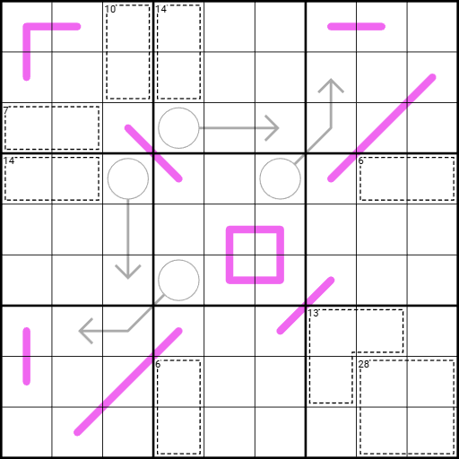 Digits on a purple line must form a non-repeating set of consecutive digits in any order.