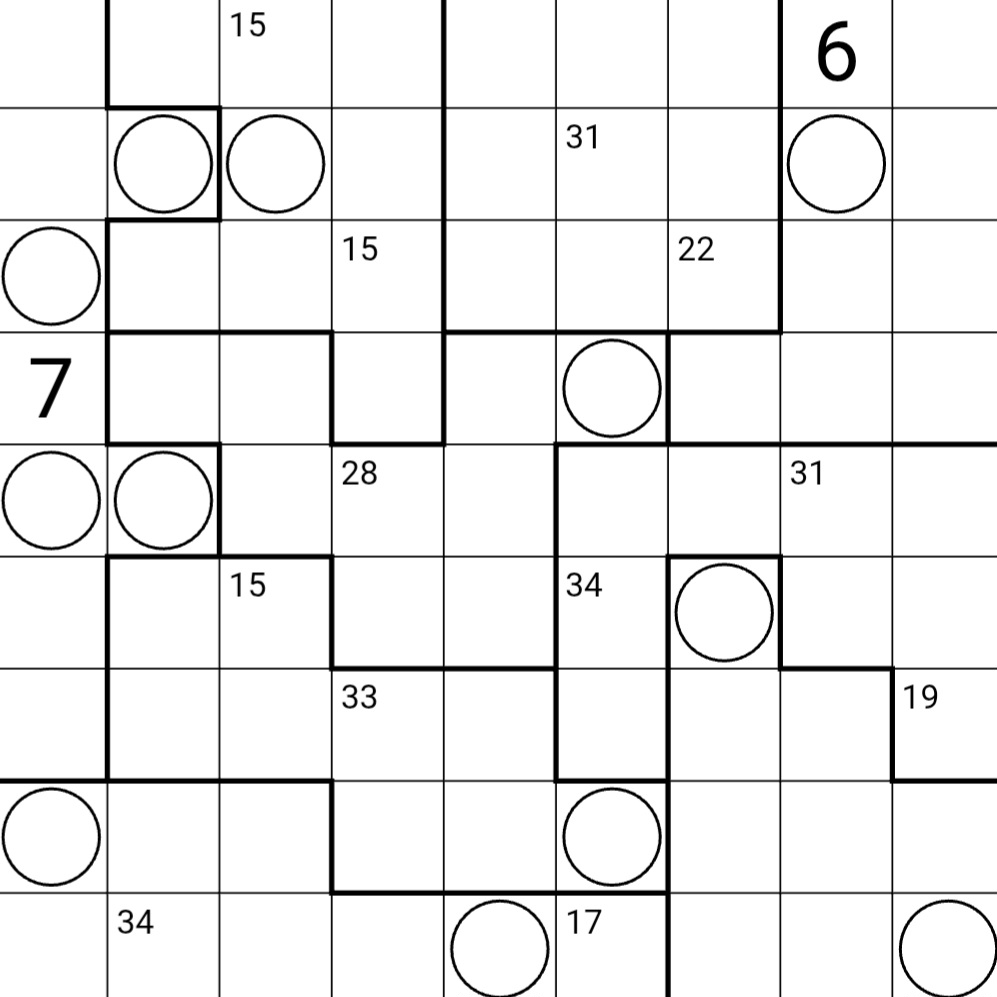 2. Place all 12 pentominoes inside the grid without repeats regardless of rotation or reflection. No pentominoes overlap. Each pentomino contains one circle and a cell with a value placed in the top left corner of the cell which is the sum of the digits placed inside of the pentomino. The digits inside a pentomino do not repeat. No pentomino is fully placed inside a given region.