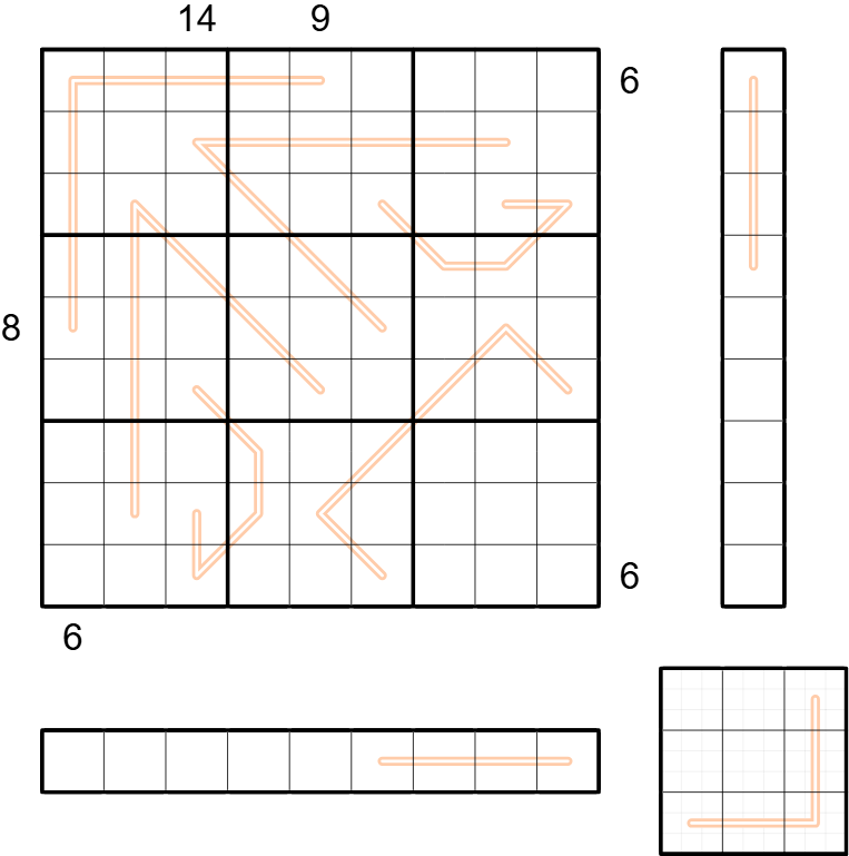 - A clue outside the grid indicates the sum of all digits from the clue up to the zero (0) in the corresponding row/column.