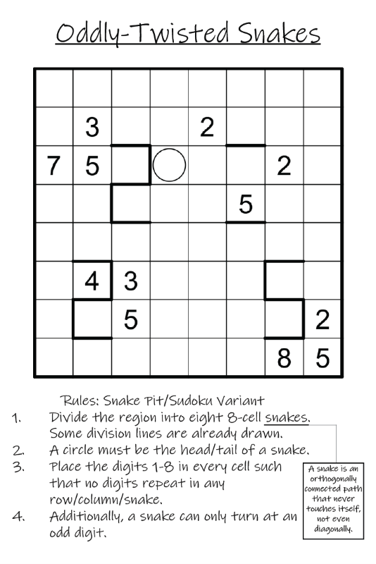 3. Place the digits 1-8 in every cell such that no digits repeat in any row/column/snake.