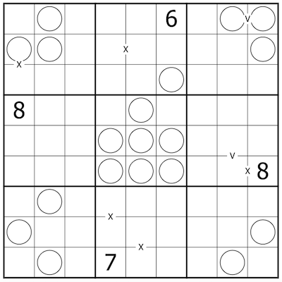 Digits separated by an X sum to 10. Digits separated by a V sum to 5. Not all such X's or V's are shown. Additionally, all shown X's and V's lie on the boundary between two rectangles.