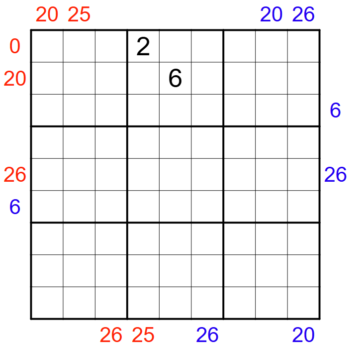 Clarification if you can't tell the colors apart: all of the clues by the right half of the grid are blue and the 6 on the left is blue, all other clues by the left half of the grid except the 6 are red.