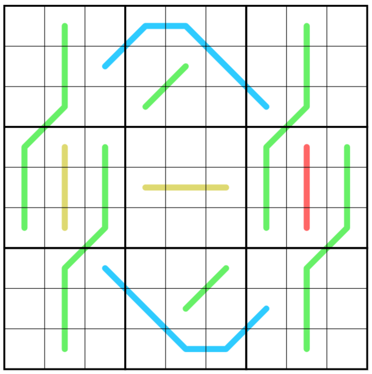 3. Region Sum Line: 3x3 box borders divide each blue line into connected segments with the same sum.