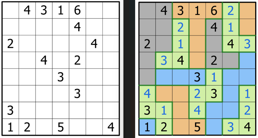 Fill the grid with 6 regions which do not touch orthogonally or diagonally and fill them with the digits 1 to 6. Divide the remainder of the grid into 9 regions, one of each size 1 to 9. Such a region may not contain repeated numbers, and it may only contain factors of its size (e.g. a region of size 6 may contain any combination of 1,2,3, and 6, including none of them).