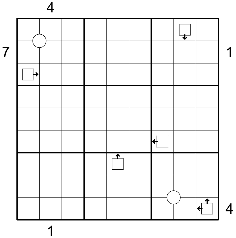 Polizisten: Dies sind Pfeile innerhalb des Gitters. Sie belegen die Zelle mit dem/den Pfeil(en) und sehen zusätzlich D weitere Zellen in Richtung jedes Pfeils, wobei D die Ziffer in der Zelle des Polizisten ist, unabhängig von der Ziffer, die die gesehene Zelle enthält.