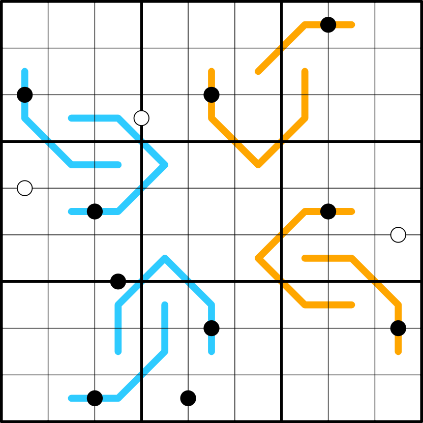 Kropki dots: Digits separated by a white dot are consecutive. Digits separated by a black dot are in a 1:2 ratio. Not all dots are necessarily given.