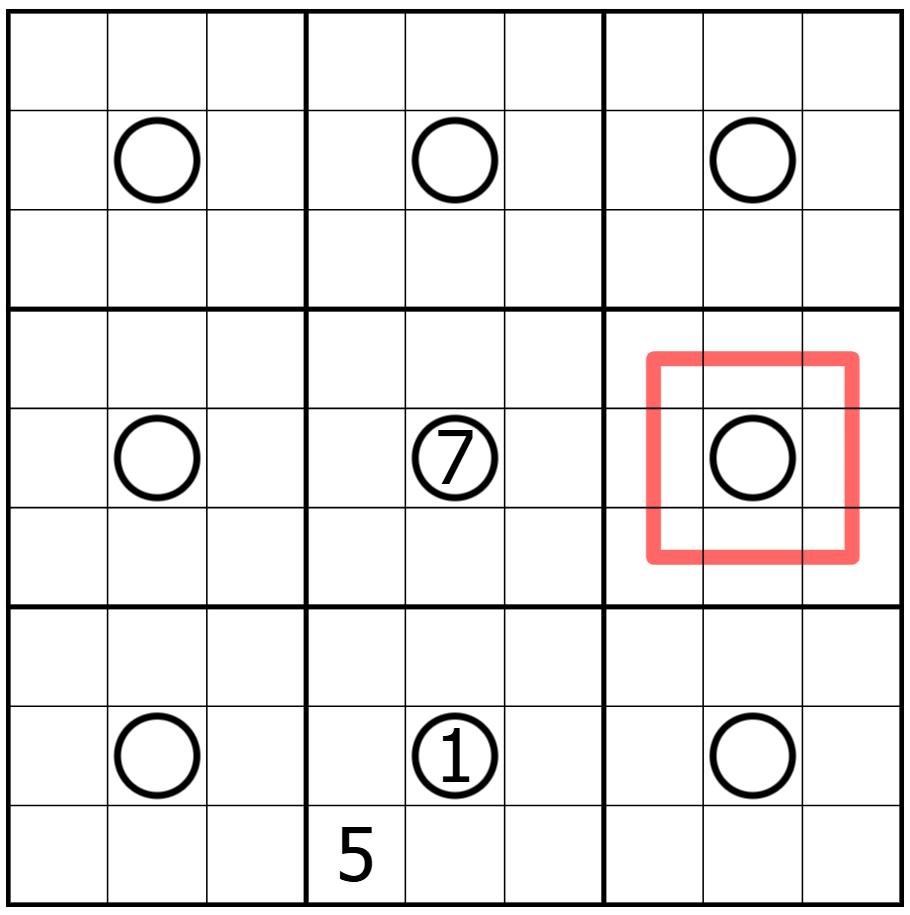Each 3×3 box contains one ring: a closed loop of the 8 outer cells of the box. The remaining center cell in the box is the central peg marked with a circle (see box 6 for an example ring).