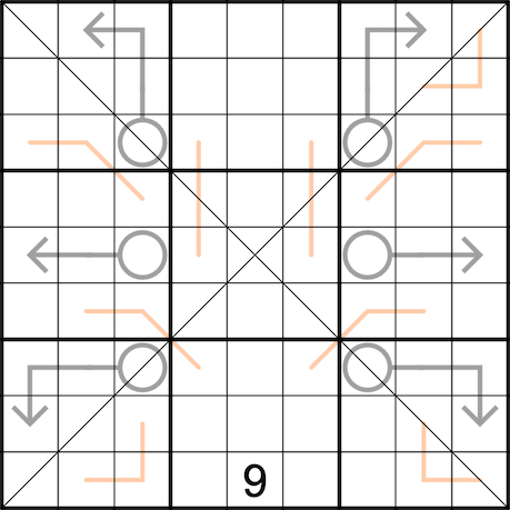 Sudoku X: The digits 1-9 must appear on each diagonal once only.