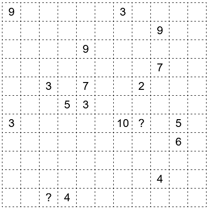 • Shade some cells such that all unshaded cells form one orthogonally connected area, and each orthogonally connected group of shaded cells touches the grid's edge. A "?" represents any positive integer, and may be different each time it appears.
