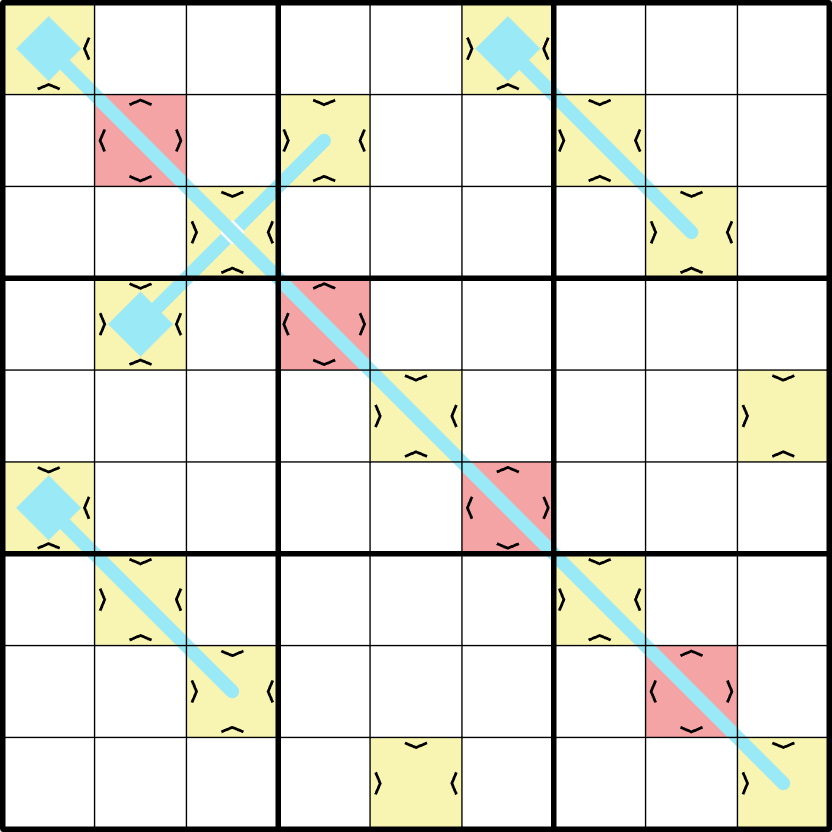 Index Lines: Each turquoise line is an Index Line, i.e. the digit in the Nth cell along such a line (starting from the diamond) indicates the position along the line where the digit N appears. For example, if a diamond cell contains a 3, the third cell along that line must have a 1.