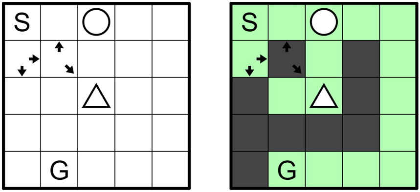 - There is exactly one orthogonal path of unshaded cells from S to G that passes through every circle, and doesn't backtrack. Triangles are unshaded but not on the path.