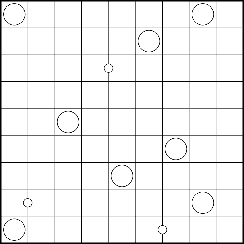 Rundweg: Zeichne einen geschlossenen Rundweg ein, der orthogonal zwischen Feldern verläuft und kein Feld mehr als einmal betritt. Der Rundweg darf die großen Kreise nicht betreten.