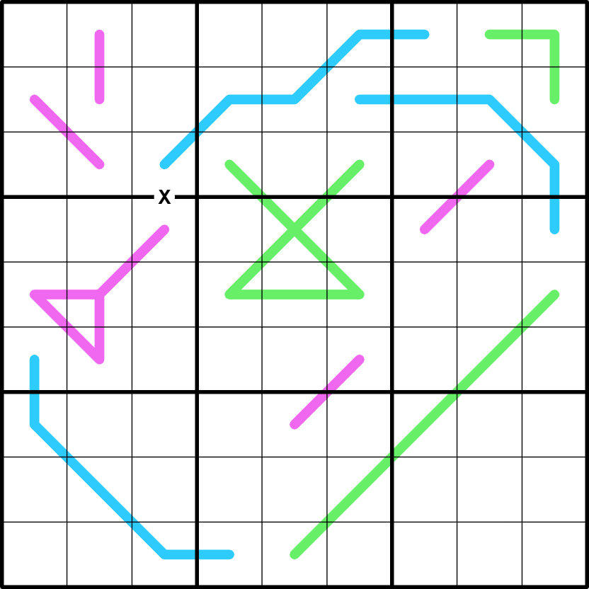 Region Sum Lines: Box borders divide the blue lines into segments with the same sum. (Different lines may have different sums.)