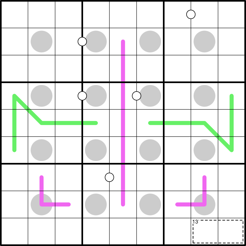 Renban: Ziffern entlang einer magentafarbenen Linie formen eine Menge aufeinanderfolgender, sich nicht wiederholender Ziffern in beliebiger Reihenfolge.
