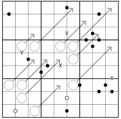 XV Pairs: Digits separated by an X sum to 10. Digits separated by a V sum to 5. Not all Xs and Vs are given.
