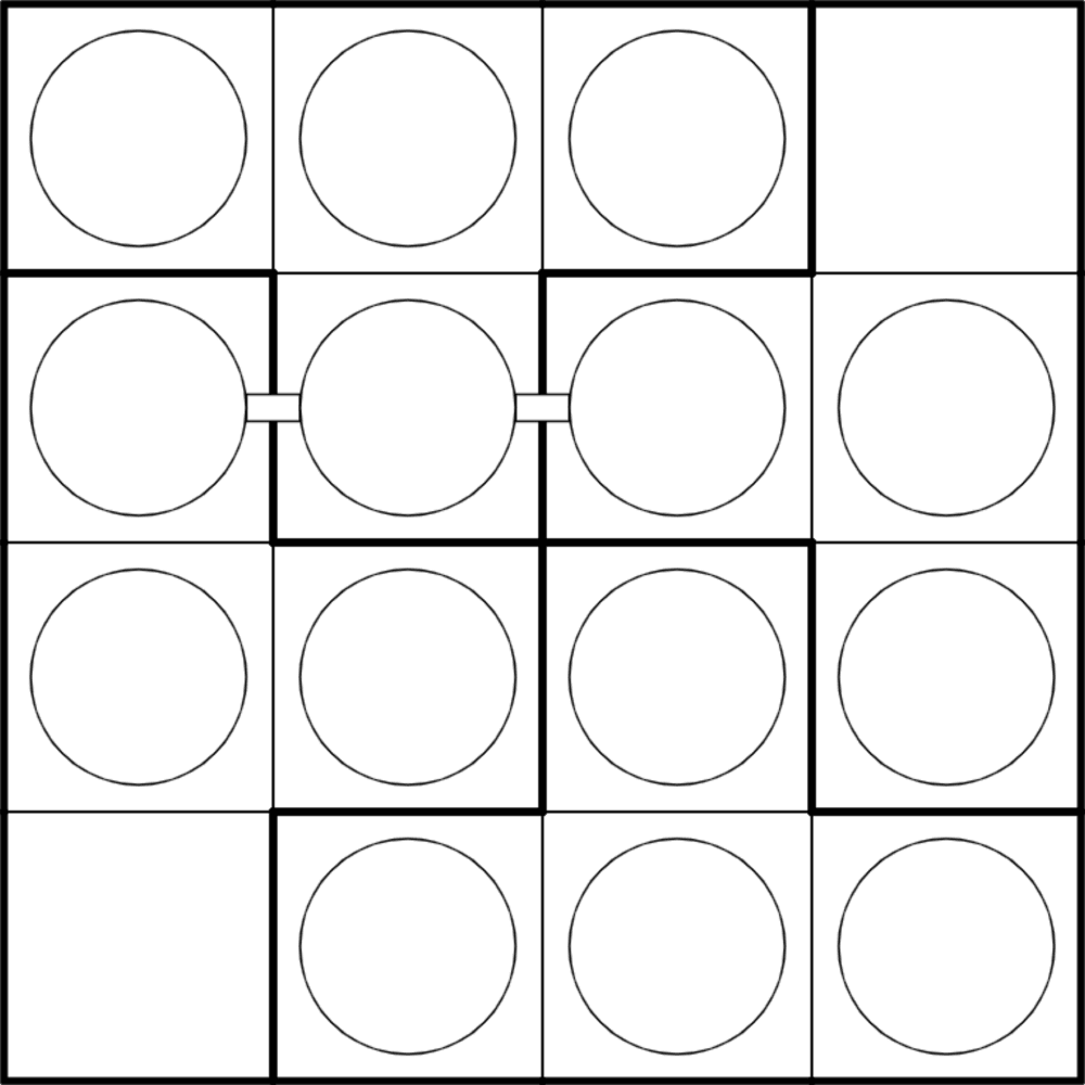 - Chaos Destruction: All given regions must be "destroyed" by making sure they do not contain all the digits 1-4. The grid also consists of four hidden, orthogonally connected regions that each do contain all the digits 1-4. Digits in Chaos Destruction circles represent how many of its orthogonally and diagonally adjacent cells, including itself, belong to both the given and hidden regions where the circle resides (i.e., where they overlap).