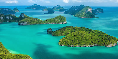 The islands are surrounded by a waterway -- a single orthogonally connected group of cells. All caged cells are waterway cells; the digit in a caged cell indicates how many waterway cells are seen orthogonally from that position, including itself (island cells block vision). The waterway cannot form any 2x2 areas.