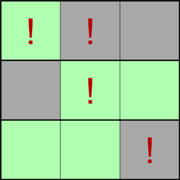 In Example 1, a 3x3 box with a Game of Life pattern is shown (green for active cells, grey for inactive cells). But the cells marked with a ! are unstable : they either are inactive but with 3 active neighbors, or active but with less than 2 or more than 3 active neighbors. Therefore this pattern is not a Still Life pattern, and can not appear in a Still Life Sudoku puzzle.